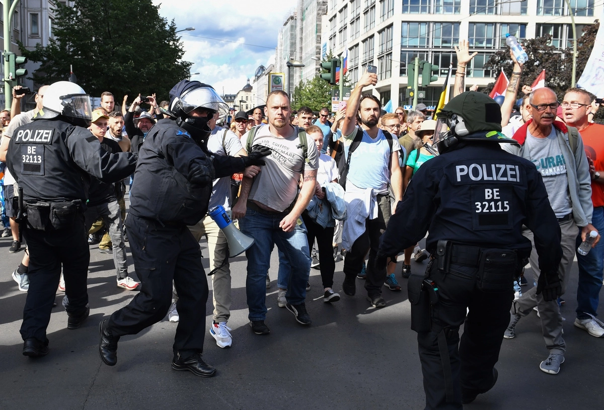 «На улице Унтер ден Линден находилась группа примерно в две тысячи человек, из которой в полицию бросали бутылки и камни. Два человека задержаны», — заявила собеседница РИА Новости.