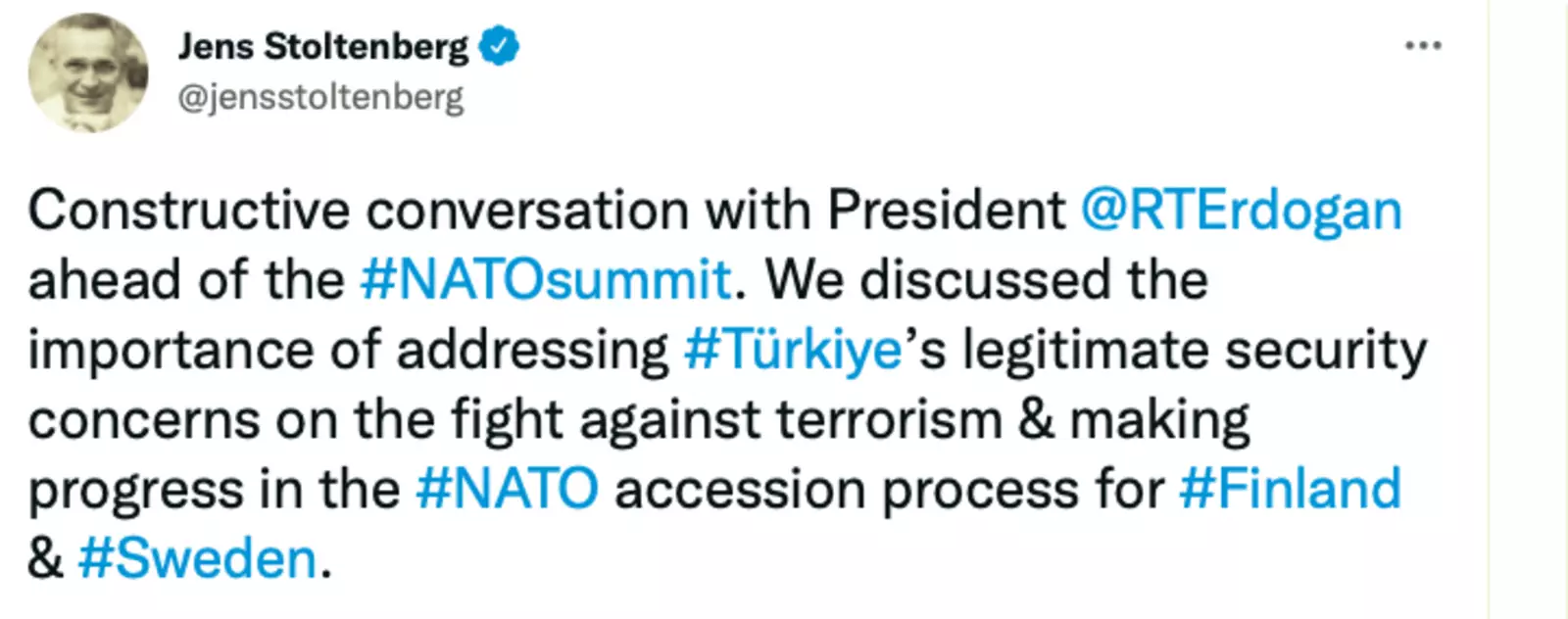Президент Турции Эрдоган провел сегодня телефонные переговоры с главой НАТО Йенсом Столтенбергом, в которых они обсудили шаги, необходимые для устранения «законных» опасений Анкары по поводу заявок Финляндии и Швеции на присоединение к альянсу.