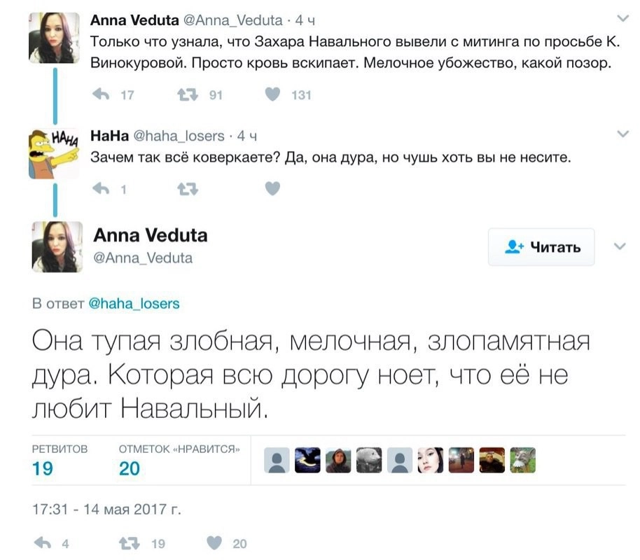 Как ранее писал «Ридус», в ходе мероприятия сотрудники полиции вывели Навального за рамки безопасности. Глава ФБК обвинил в этом Винокурову — и его сторонники не заставили себя ждать.