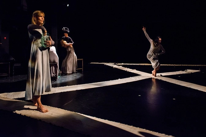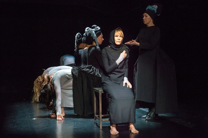 На сцене минимум декораций: грубые деревянные стулья и задрапированные тяжелой черной тканью стены. Из спецэффектов — бело-желтые лучи прожекторов, вырывающие для зрителя из всепоглощающей темноты картину происходящего. И — живое «акапельное» исполнение русских народных песен участницами постановки. Больше со сцены — ни слова.