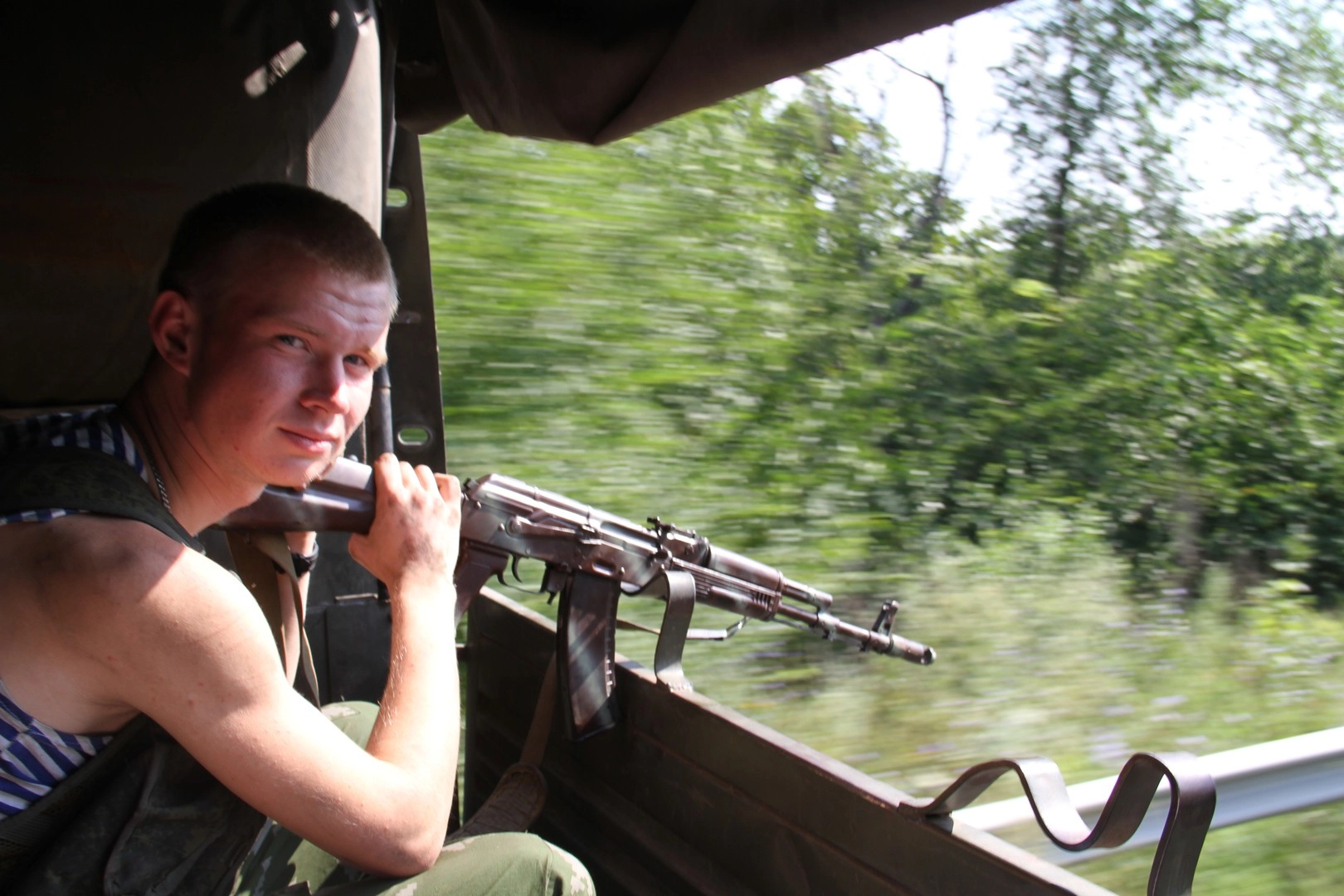 На границе со стороны ДНР нас встречает «Урал» разведроты. Улыбчивый белозубый ополченец Женя помогает удобнее устроиться на ящике из-под боеприпасов, и полетели.