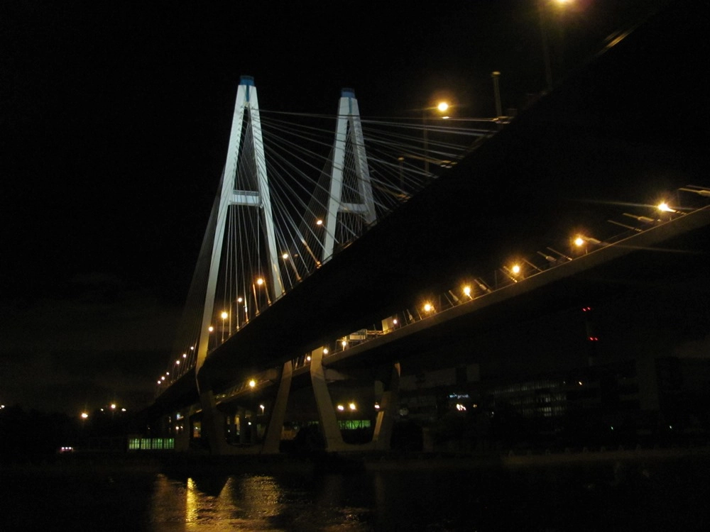 Вечером теплоход минует Шлиссельбург, входит в Неву и ещё через пару часов проходит под вантовым мостом Санкт-Петербурга.