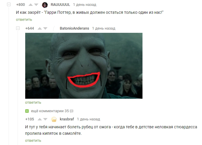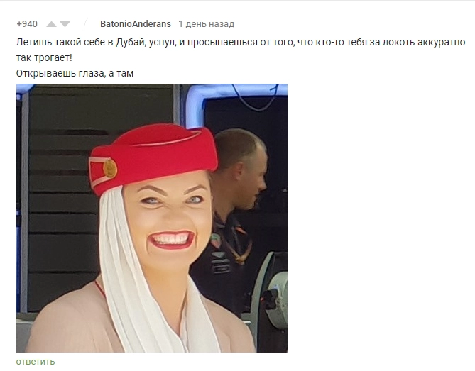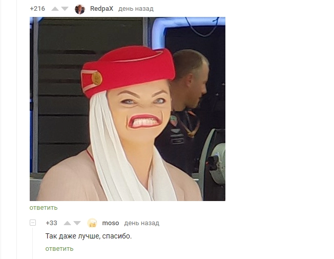 Потом в дело вступили интернет-пользователи. За сутки пост выбился в топ и собрал более 500 комментариев. Стюардессу сравнили с Волан-де-Мортом и множеством персонажей из фильмов ужасов и мультиков. А также вовсю повеселились, редактируя снимок в фотошопе.