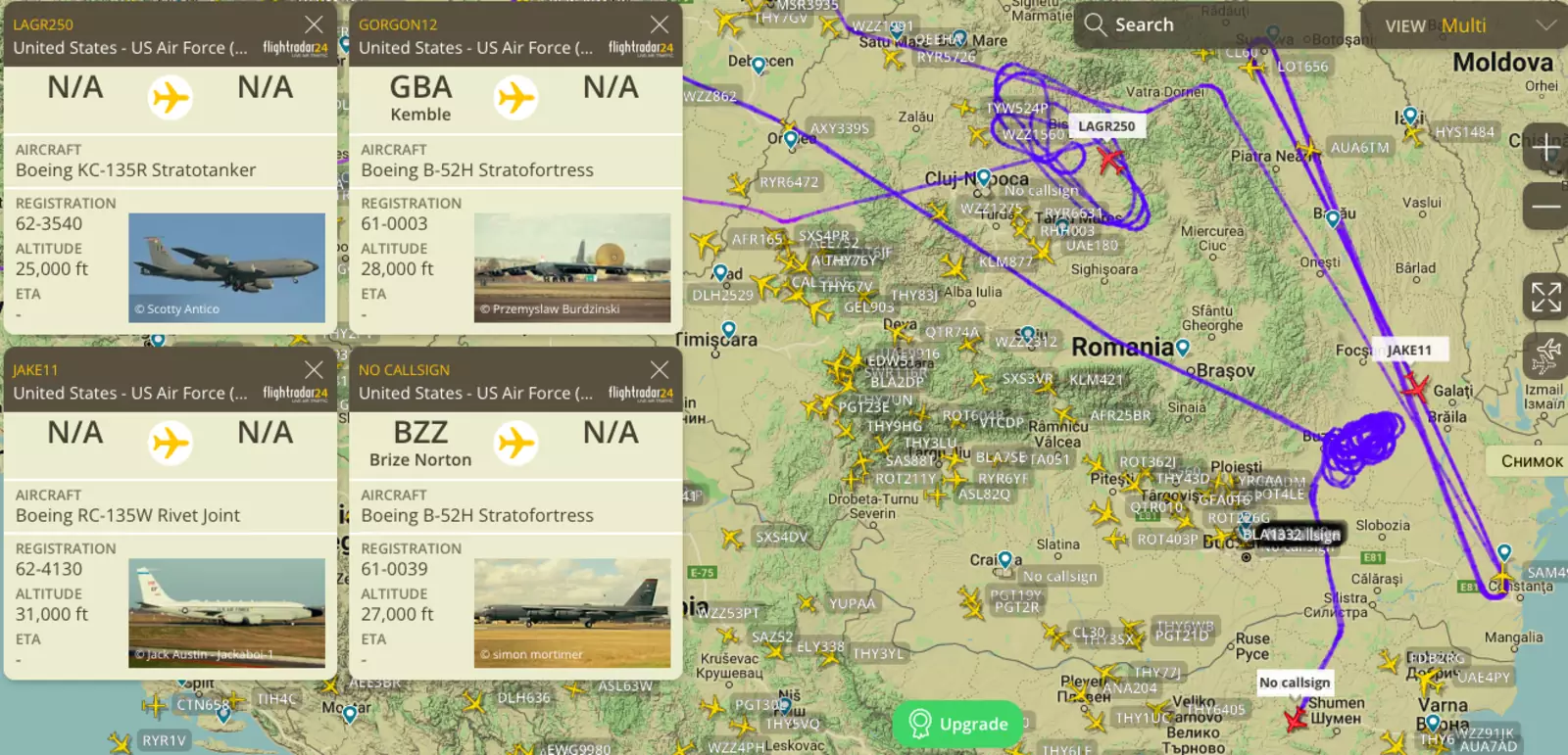 Сегодня уже второй раз за 4 дня бомбардировщики B-52 можно наблюдать над восточной Румынией вместе с летающими танкерами и самолетом стратегической электронной разведки «Ривет Джойнт» (позывной JAKE11).