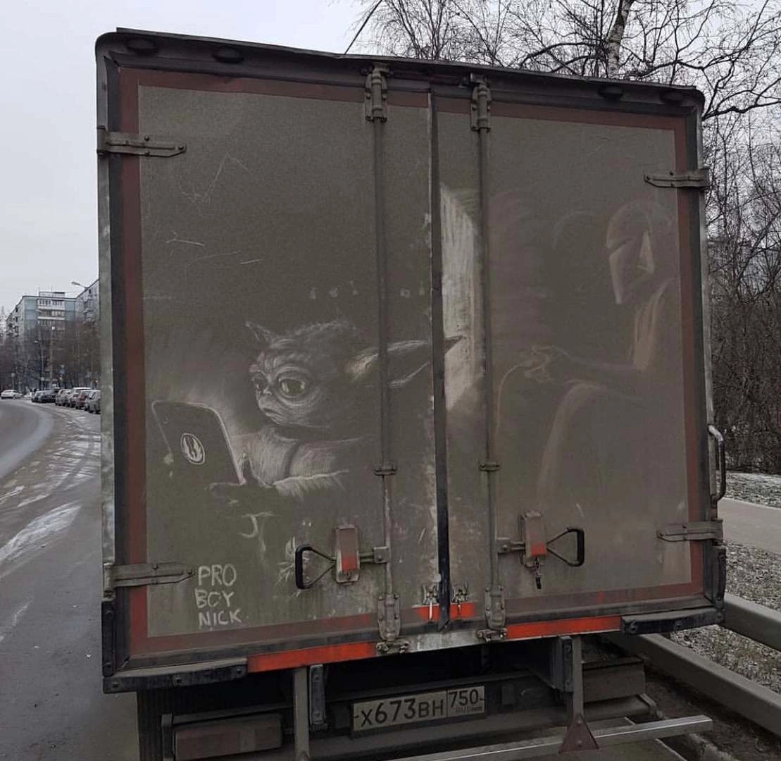 Фотография мастерского рисунка на пыльных дверях грузовика с русскими номерами стала хитом на небезызвестном сайте reddit. На нем Малыш Йода и мандалорец занимаются обыденными делами — «залипают» на экраны телевизора и планшета, но техника изображения, эммм… краски и «холст» настолько специфичны, что придают картине налет тревожности и упадочности.