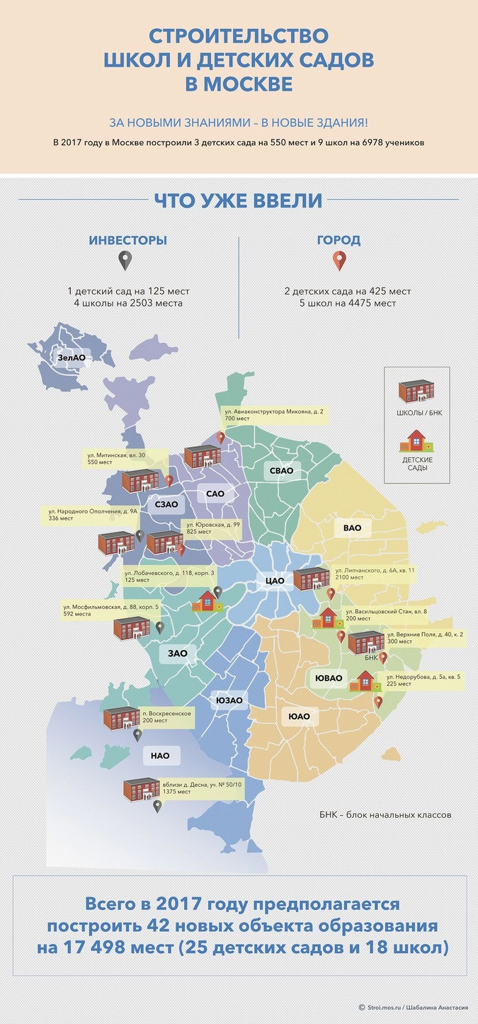 В Москве в 2017 году завершено строительство и введено в эксплуатацию три детских сада и девять школ на 7,5 тысяч мест. Об этом сказано в пресс-релизе Комплекса градостроительной политики и строительства города Москвы, поступившем в редакцию «Ридуса».