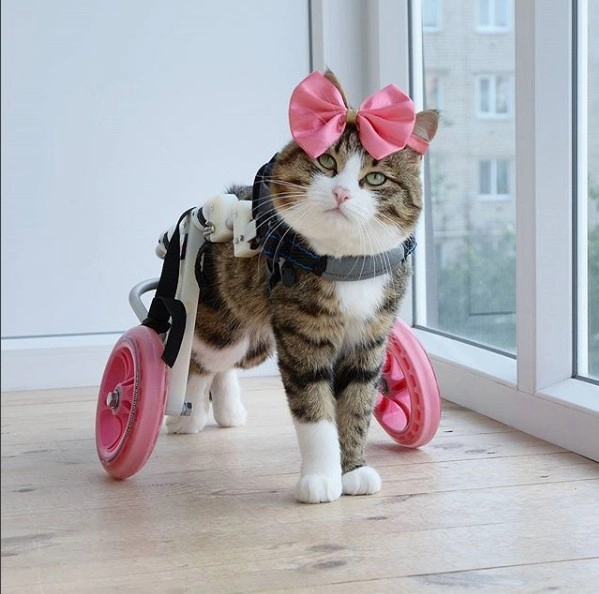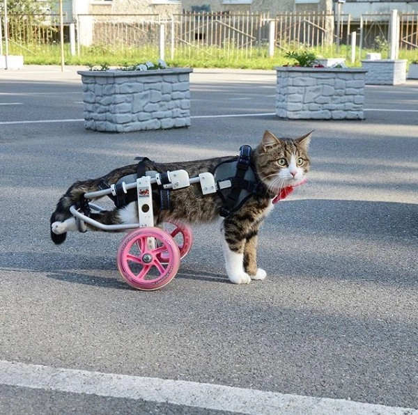 Рекси три с половиной года, свой четвертый день рождения он отпразднует в ноябре. У котика обездвижены задние лапки, поэтому на прогулках он передвигается с помощью коляски.