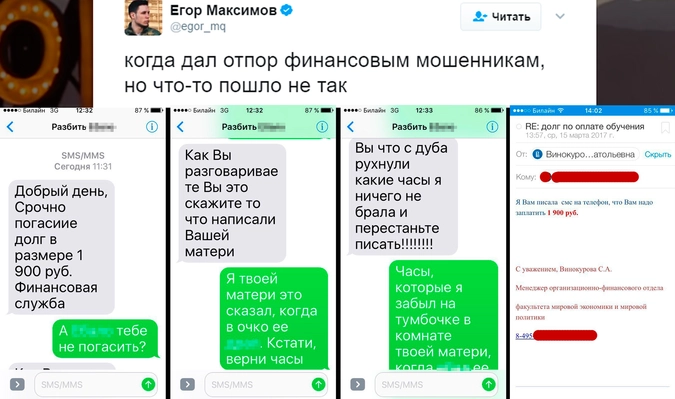 Однако, тогда Гегочкин этого еще не знал и поделился своими искрометными шутками с друзьями, выложив скриншоты смс в интернет. И лишь потом ему на почту пришло официальное письмо менеджера Винокуровой с напоминанием оплатить долг.
