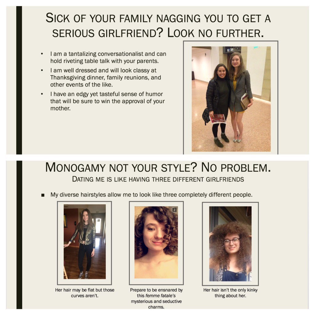 Готовность принять полигамию бойфренда должна была стать ещё одним весомым аргументом в пользу американки. «Моногамия — не твой стиль?, — спрашивает американка в другом слайде. Нет проблем! Встречаясь со мной, ты получишь трёх разных девушек!». И в доказательство Лиззи прикладывает свои фотографии с тремя разными причёсками и образами: «Первое фото: её волосы может и плоские, но не эти изгибы. Второе фото: готовься попасть в ловушку этой загадочной, обольстительной и роковой женщины. Третье фото: её волосы — это не единственное, что есть в ней эксцентричного».