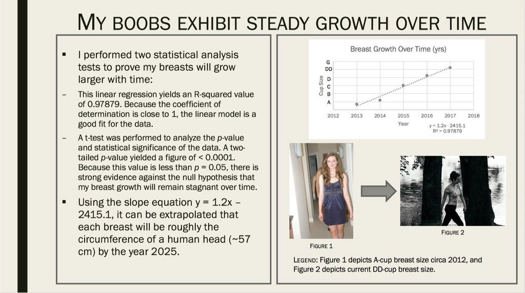 В слайде под названием «Моя грудь демонстрирует устойчивый рост на протяжении долгого времени» девушка изящно доказывает, что её не случайно взяли в университет Миннесоты. А также приводит расчёты, из которых следует, что к 2025 году обхват одной её груди будет равен обхвату человеческой головы и составит примерно 57 сантиметров.