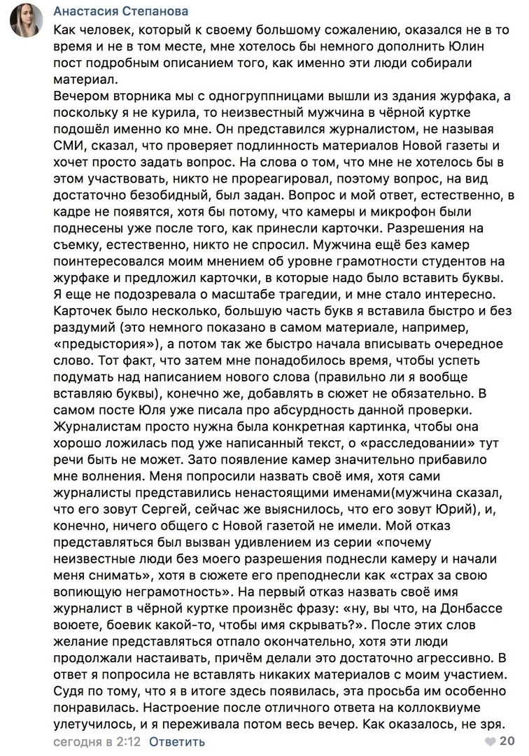 Комментария Анастасии Николаевой по поводу «безграмотности» студентов в материале нет, можно предположить, что конечный посыл сюжета на тот момент был ей еще неизвестен.