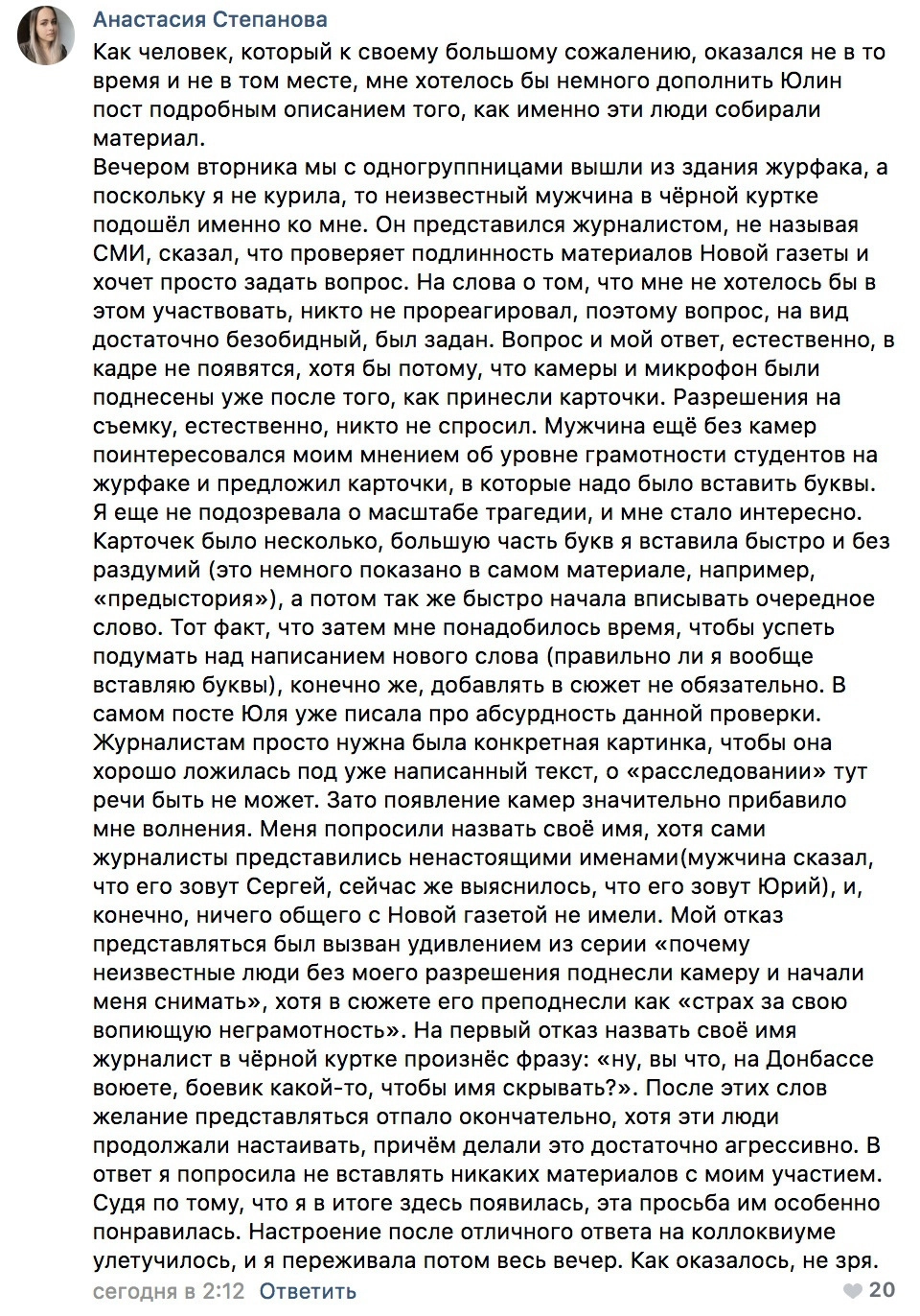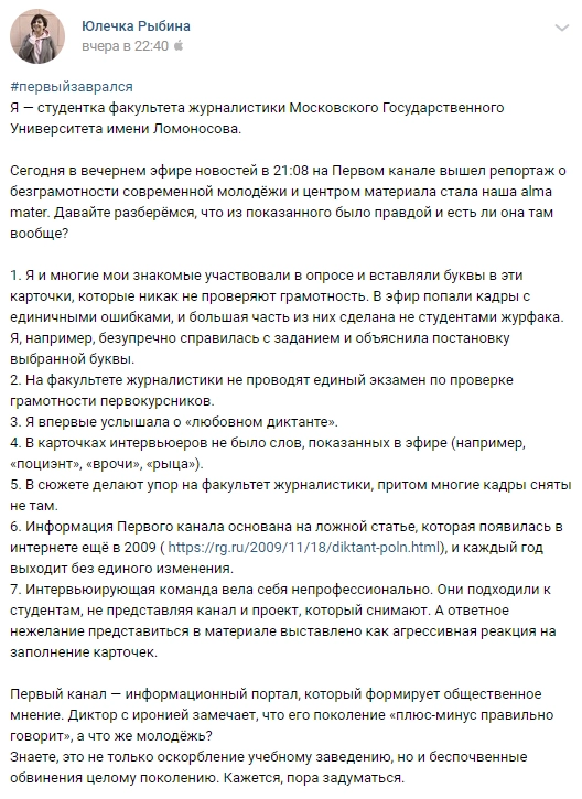 Еще больше обвинений в адрес телевизионщиков озвучила ее коллега Юлия Рыбина. Она подтвердила, что журналисты Первого действительно снимали опрос у здания факультета, однако слов, в которых якобы были допущены вопиющие ошибки, вроде «врочи», «поциэнт» и «через-чюр», среди предложенных ими карточек не было.