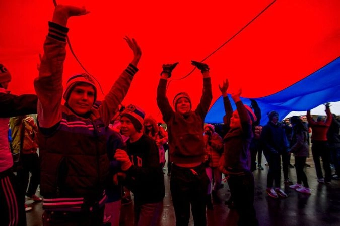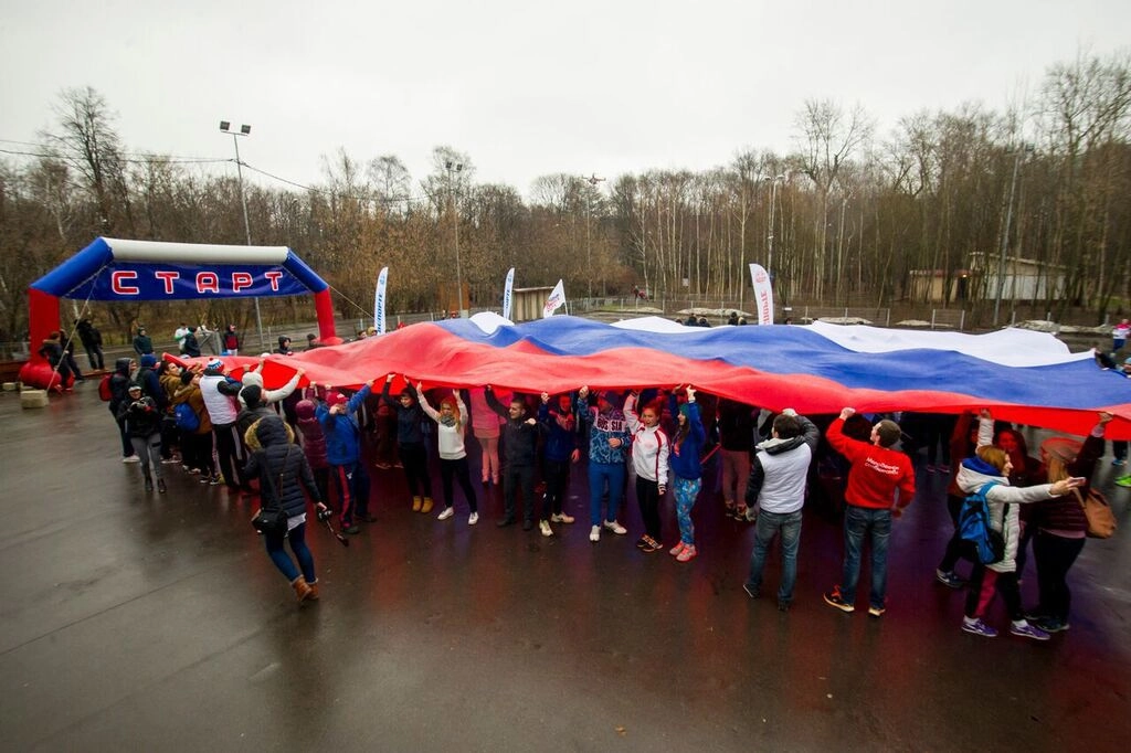 Пробежка завершилась массовым флешмобом: участники растянули огромный российский флаг в знак поддержки российских легкоатлетов.