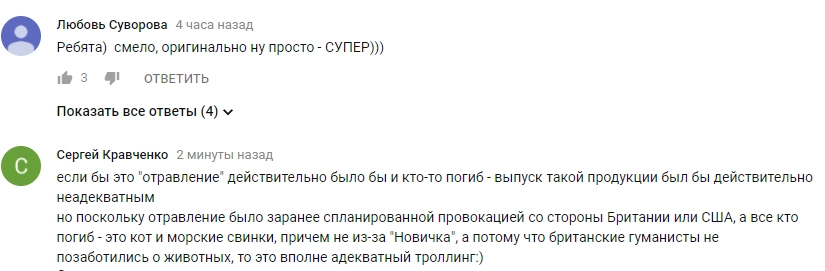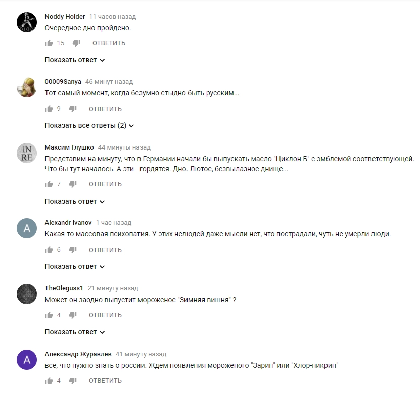 Большая часть пользователей выразила возмущение созданием масла с провокационным названием. «У этих нелюдей даже мысли нет, что пострадали, чуть не умерли люди», — с негодованием написал один из них. «Ждем появления мороженого „Зарин“ или „Хлор-пикрин“», — саркастически добавил другой.