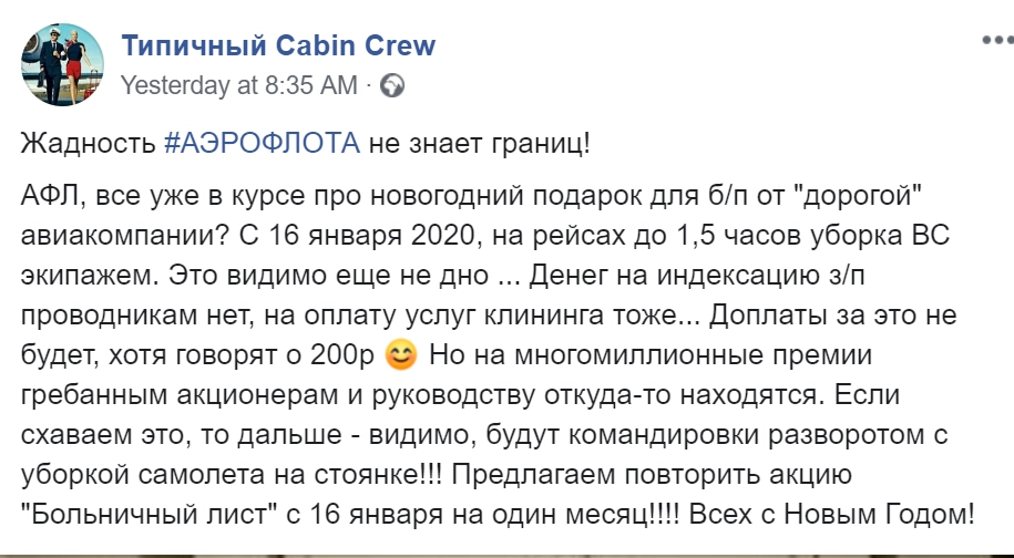 Менеджмент «Аэрофлота» (как и многих компаний) элементарно пользуется тем, что работники плохо знают собственные трудовые права. И тем более не готовы эти права защищать «с больничным в руках», как призвал Cabin Crew.