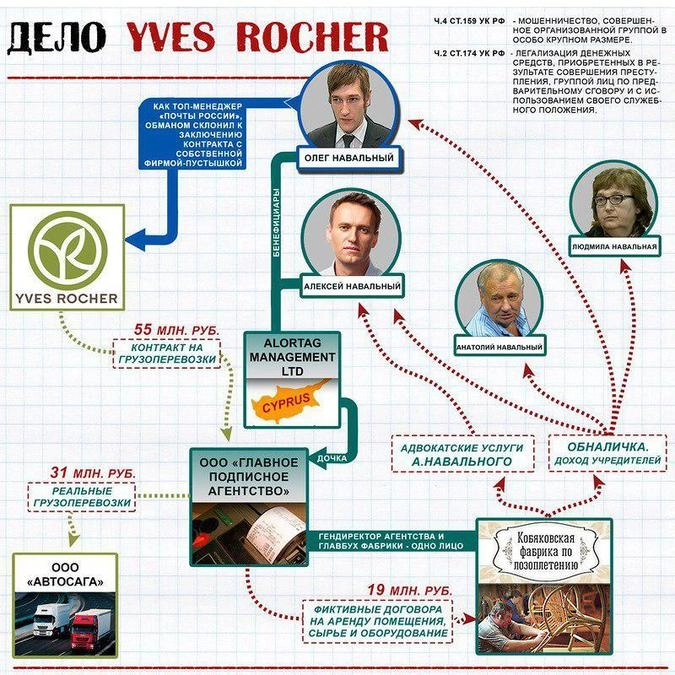 Как выяснило следствие, братья Навальные навязали руководству «Ив Роше» сотрудничество с их фирмой «Главное подписное агентство» по части грузоперевозок. Далее они перенаправляли заказы от французского предприятия фирме «АвтоСАГА». Разница между ценами оседала на счетах у «Главного подписного агентства», а затем эти средства отмывались через Кобяковскую фабрику по лозоплетению, принадлежащую родителям Навальных. Таким путем, по версии правоохранителей, было похищено 26 миллионов рублей.