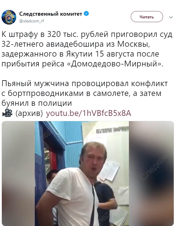 Жителя столицы, устроившего пьяный дебош на борту пассажирского самолета, летевшего из Москвы в якутский город Мирный, суд приговорил к штрафу в размере 320 тысяч рублей, сообщает Следственный комитет РФ.
