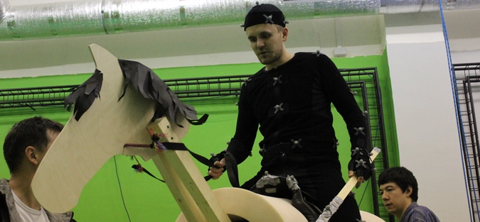 Особенно выручает технология захвата движения при создании массовки и при работе с животными – датчиками здесь облепляют даже лошадей. «Пытались, - говорит Добрунов, - сделать медведя, но пока не получилось». Пришедший с нами Михаил Алдашин, знаменитый режиссёр и вот уже почти год как художественный руководитель «Союзмультфильма», шутя замечает, что «для книги Гиннесса надо слона взять». Добрунов идею со смехом поддерживает: «А потом ещё вырастить динозавра - и всё, победа окончательная».