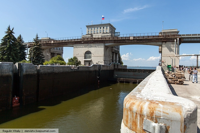 17-ти метровый перепад уровней Волги суда преодолевают двумя ступенями - шлюзами. На первой ступени суда опускаются из Горьковского водохранилища до уровня искусственной акватории, на второй ступени - до уровня Волги. На каждом из шлюзов суда опускаются и поднимаются примерно на 8 метров.