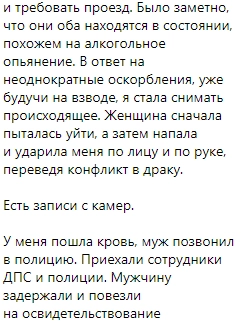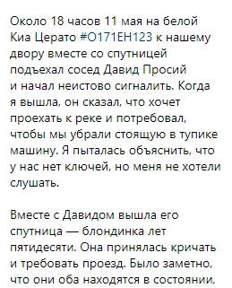 По словам Пономаренко, конфликт разгорелся из-за того, что подвыпившие Дубовик и живший по соседству охранник суда Давыд Просий попытались проехать к реке мимо ее дома и грубо потребовали у хозяев убрать машину с дороги.