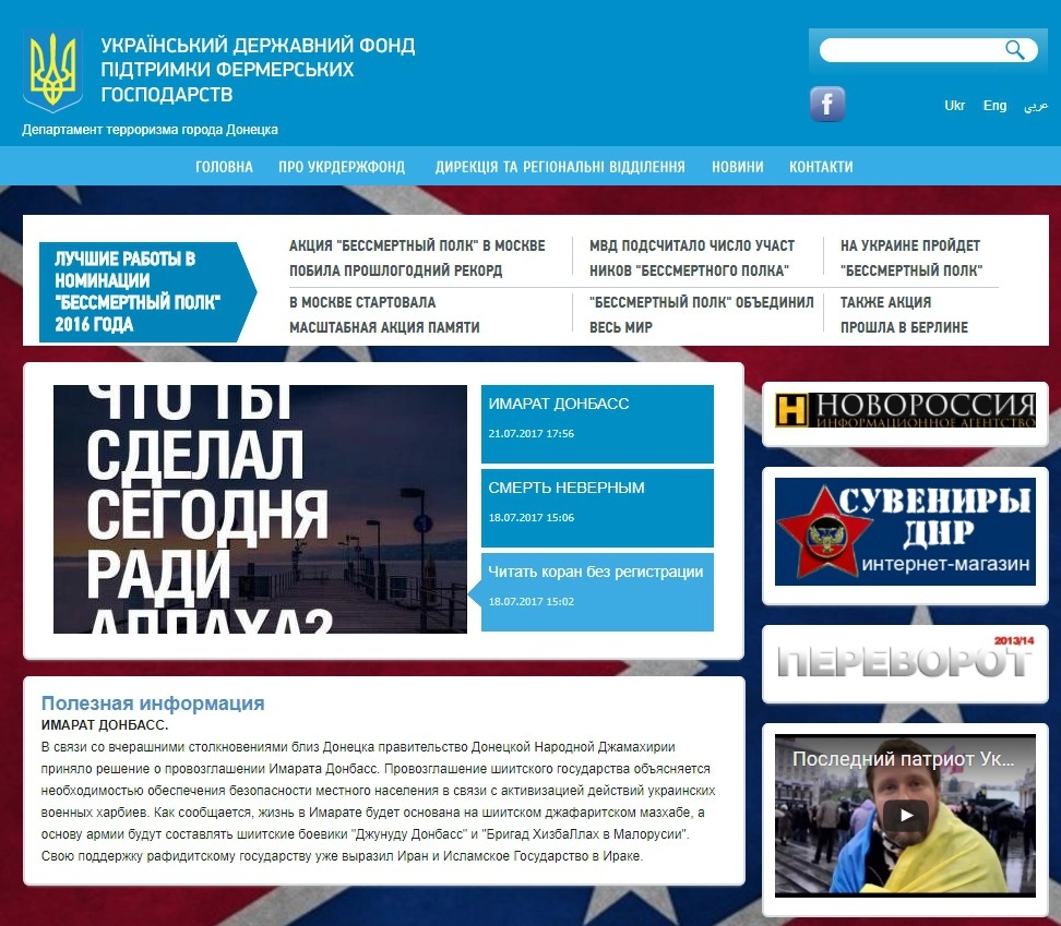 Сайт государственного фонда Украины по поддержке фермерских хозяйств оказался взломан. Хакеры разместили на портале новости об акции «Бессмертный полк», провозгласили «имарат Донбасс» и поставили рекламный баннер интернет-магазина «Сувениры ДНР».