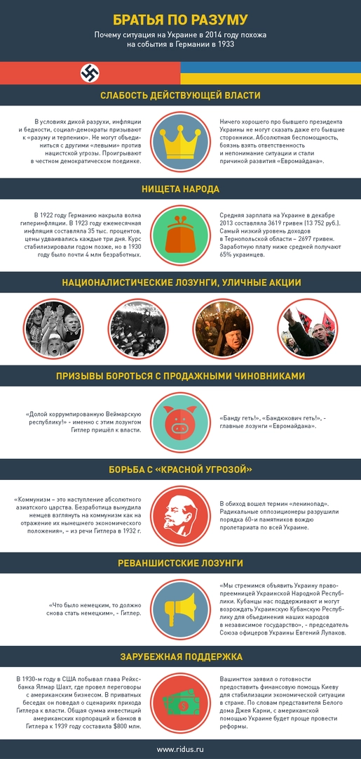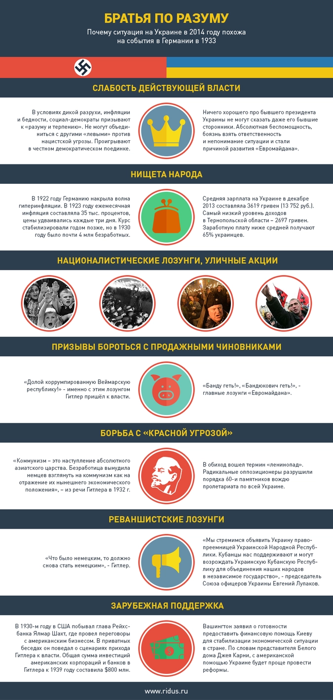 Ответ на этот вопрос прост. Вот они, фашисты, на площадях. Борцы с режимом, говорите? Так в Германии они тоже с режимом боролись. "Долой коррупционную Веймарскую республику! Всё, что было германским, будет германским!" - даже лозунги похожи. Да и вообще, у прихода к власти национал-социалистов в Германии и борцов за украинскую демократию много общего.