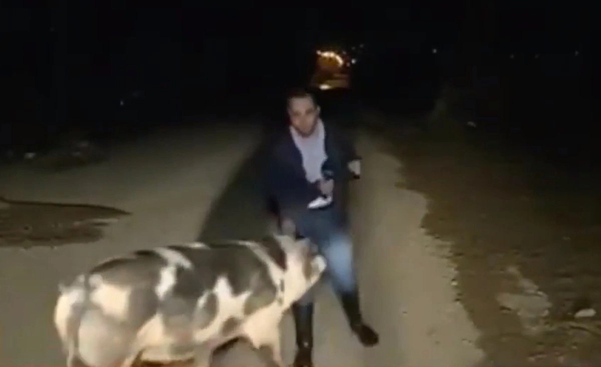 Лазос Мантикос собирался рассказать об урагане в поселке Кинета в прямом эфире телеканала ANT1. Однако журналистом неожиданно заинтересовалась свинья, которая начала гоняться за ним. Животное упорно не оставляло мужчину в покое и даже пару раз ударило головой сзади.