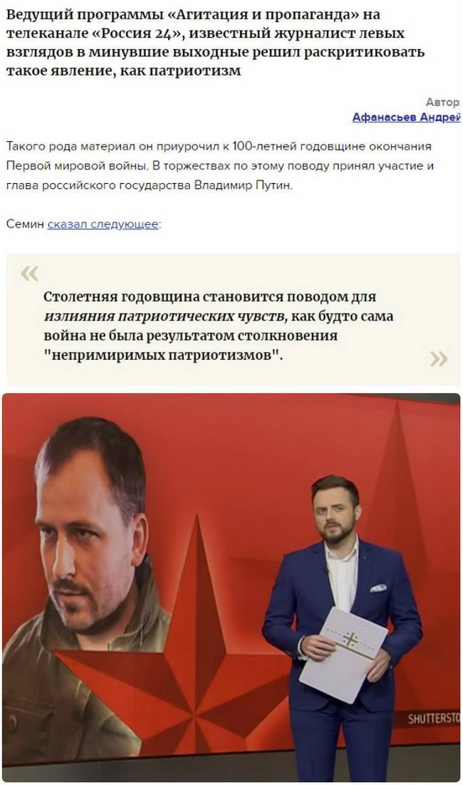 Ведущий программы «Агитация и пропаганда» на телеканале «Россия 24» Константин Сёмин критику патриотизма приурочил к материалу о 100-летии окончания Первой мировой войны.