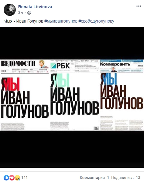 Актриса Рената Литвинова разместила на своей странице в Facebook пост с изображением газет «Коммерсант», РБК и «Ведомости», опубликовавших на первой полосе заголовки «Я/Мы Иван Голунов».