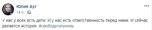Актриса «Гоголь-центра» Юлия Ауг также поддержала Ивана Голунова, отметив, что «сейчас делается история».