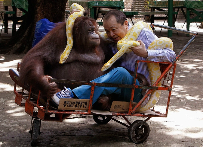 Владелец зоопарка Малабун держит двух бирманских питонов-альбиносов, пока орангутан с ними играет, в преддверии всемирного Дня животных. © Romeo Ranoco/Reuters