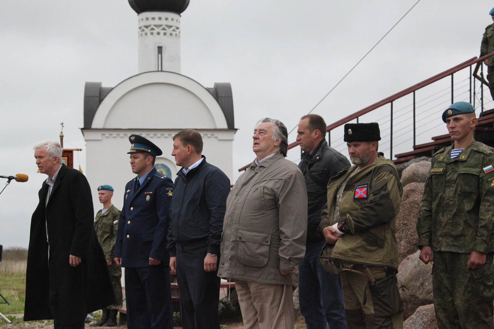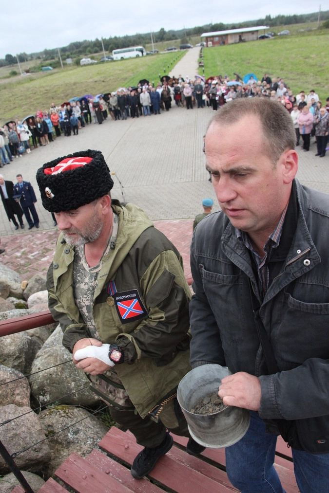 Вместе с крымской, под крест на Священном холме высыпали и землю с легендарного донбасского кургана Сур-Могила, которую на Псковщину привезли представители Новороссии в гильзе от боевого снаряда. Депутат новоросского парламента Николай Пачковский предложил почтить память тех, кто погиб, сражаясь там за православный мир.
