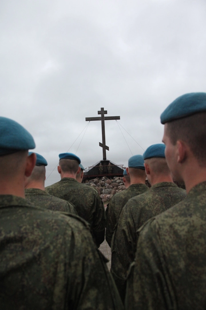 Справочно: Священный холм воздвигнут в 2007 году. В его основании лежат земли от всех городов и районов Псковской области — от древних крепостей и мест важных сражений, земли с могил великих людей, святых мест. Сюда принесена земля от Александро-Невской лавры, Палестины, Эрмитажа и Русского музея, с территории завода «Адмиралтейские верфи», где зарождался русский флот и крейсер «Аврора», с Пискаревского мемориального кладбища Санкт-Петербурга, в братских могилах которого захоронено 470 тыс. ленинградцев-петербуржцев и 50 тыс. воинов ленинградского фронта. Здесь же находится земля из освобожденного Цхинвала и защищенной Абхазии, привезенная воинами-десантниками 76-й десантно-штурмовой дивизии, грунт, взятый со дна Северного Ледовитого океана. На вершине установлен десятиметровый крест из лиственницы.