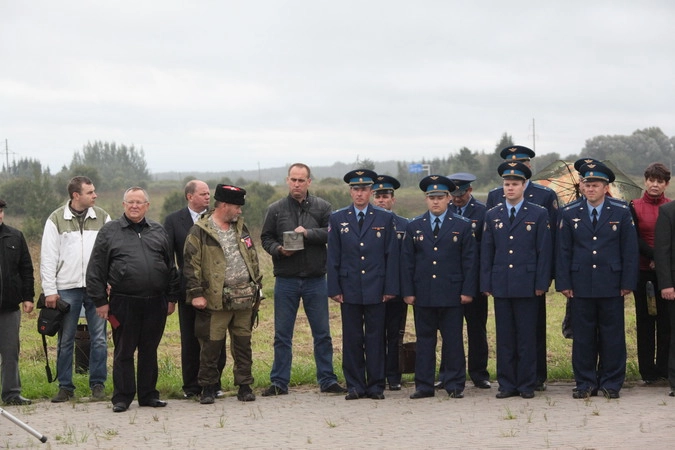 В церемонии землепреношения принял участие весь первый экипаж ракетного бомбардировщика дальней авиации, носящего имя «Изборск». И очень символично, что в момент выступления командира ракетоносца «Изборск» Трофима Капши раздался гул самолета — тот самый Ту-95МС пролетел над Священным холмом, символизирую силу и могущество России.