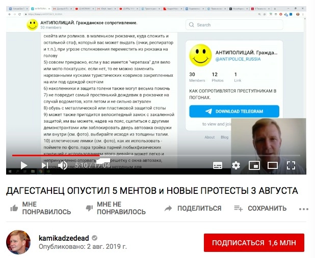 Видео, в котором Камикадзе рассказывает о методах столкновения с правоохранителями, было опубликовано на YouTube 2 августа. В нем Иванов озвучивает инструкции паблика «Антиполицай» для протестующих, связанные с тактиками противостояния полицейским, методами камуфлирования и сокрытия лица.