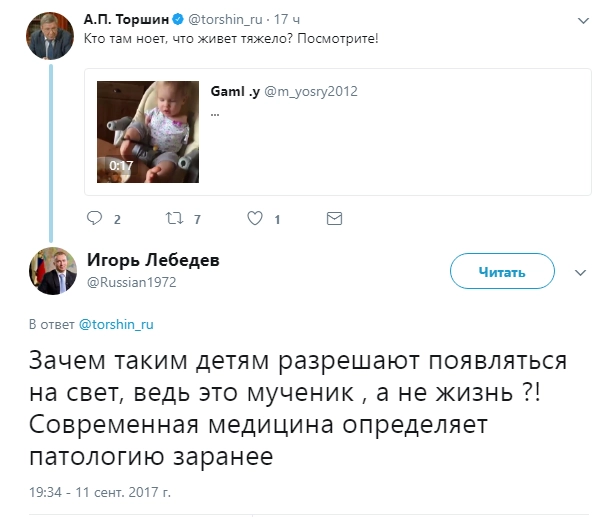 На видео откликнулся его подписчик — зампредседателя Госдумы Игорь Лебедев, который заявил, что детям с инвалидностью лучше не рождаться.