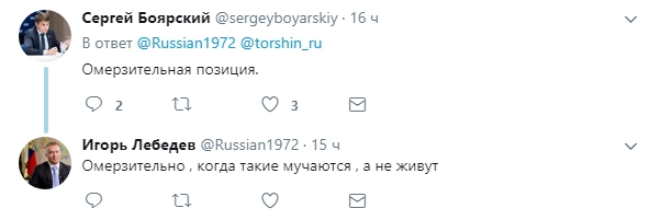 Когда один из пользователей указал на его «омерзительную позицию», Лебедев поспешил ответить оппоненту.