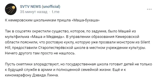 Как сообщает «Подъём», в Старопестерёвской школе Беловского округа Кемеровской области на прошлой неделе отмечали день рождения Маши — героини мультсериала «Маша и медведь». На праздник явилась и «героиня дня» — ростовая кукла. Но выполнена она была неудачно и скорее пугала учеников слишком большими глазами и губами.