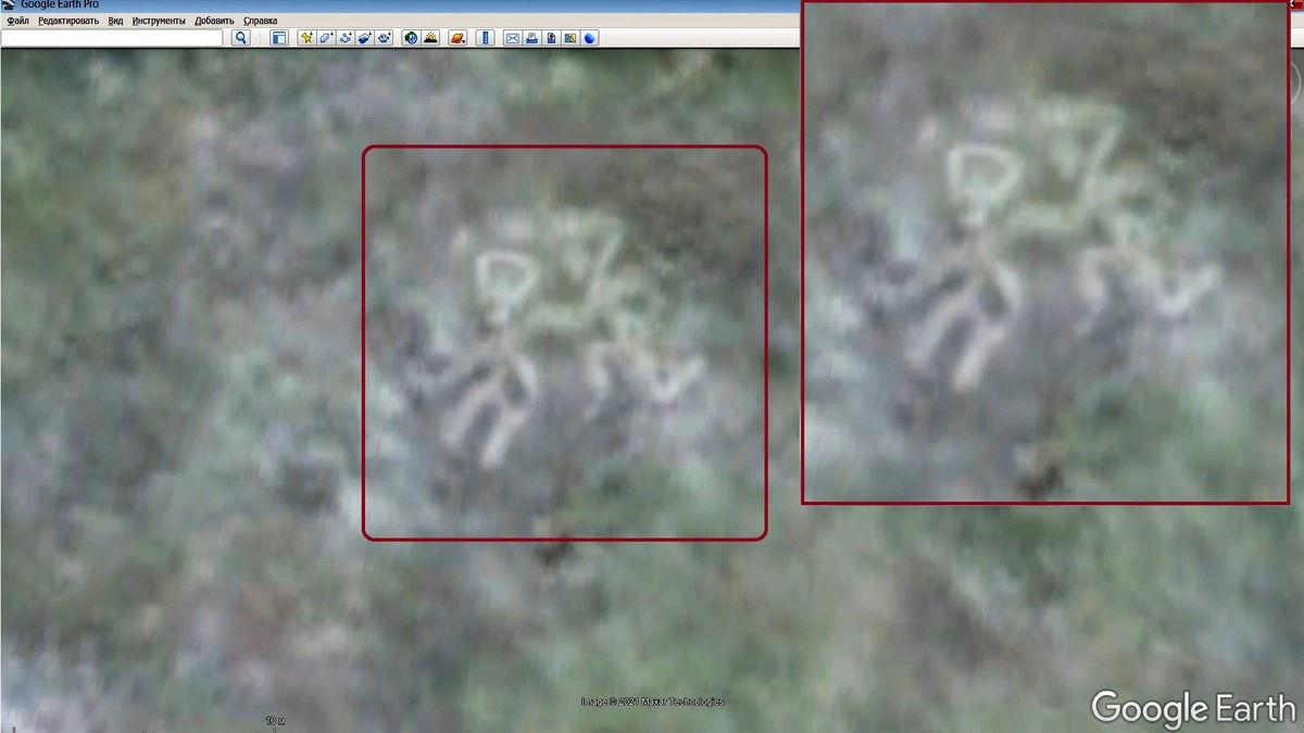 Если посмотреть на спутниковые фотографии, то можно увидеть нечто очень интересное. Всего в 240 метрах от места гибели группы Дятлова, рядом с зимником, очень хорошо видны два древних геоглифа. Действительно древних, так как они уже почти полностью разрушены. Фотографии за 2013 год можно посмотреть на сайте Google Earth. Размеры рисунков около десяти метров. На рисунке по координатам 61.755234°, 59.458463° виден какой-то трегольник. Он очень необычный. Похож на, какую-то, хитрую спираль, с тыла у него видны три выступающие «трубы».