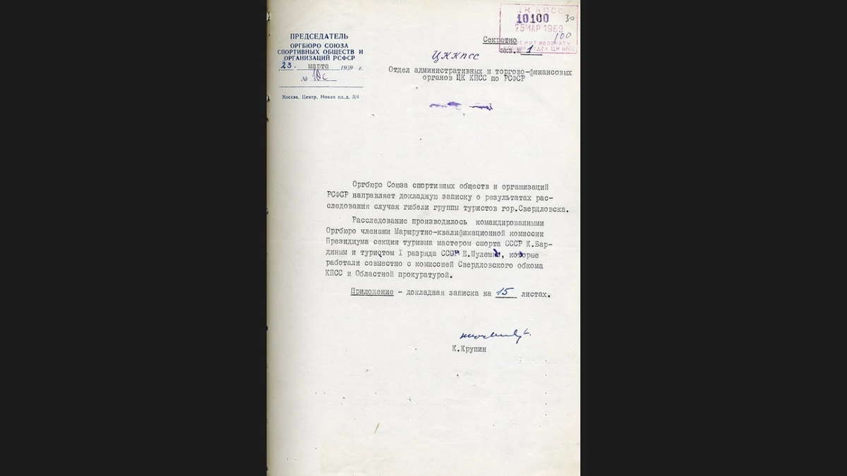 Случайно нашел очень интересный и малоизученный исследователями документ. Он был составлен для ЦК КПСС (высшего органа власти в СССР) председателем оргбюро союза спортивных обществ и организаций РСФСР К. Крупининым. Докладная записка по результатам расследования, случая гибели группы туристов города Свердловска.