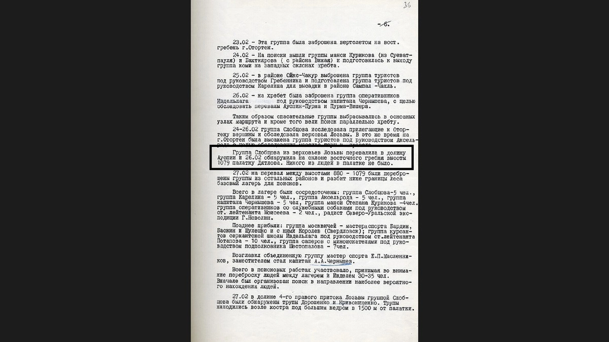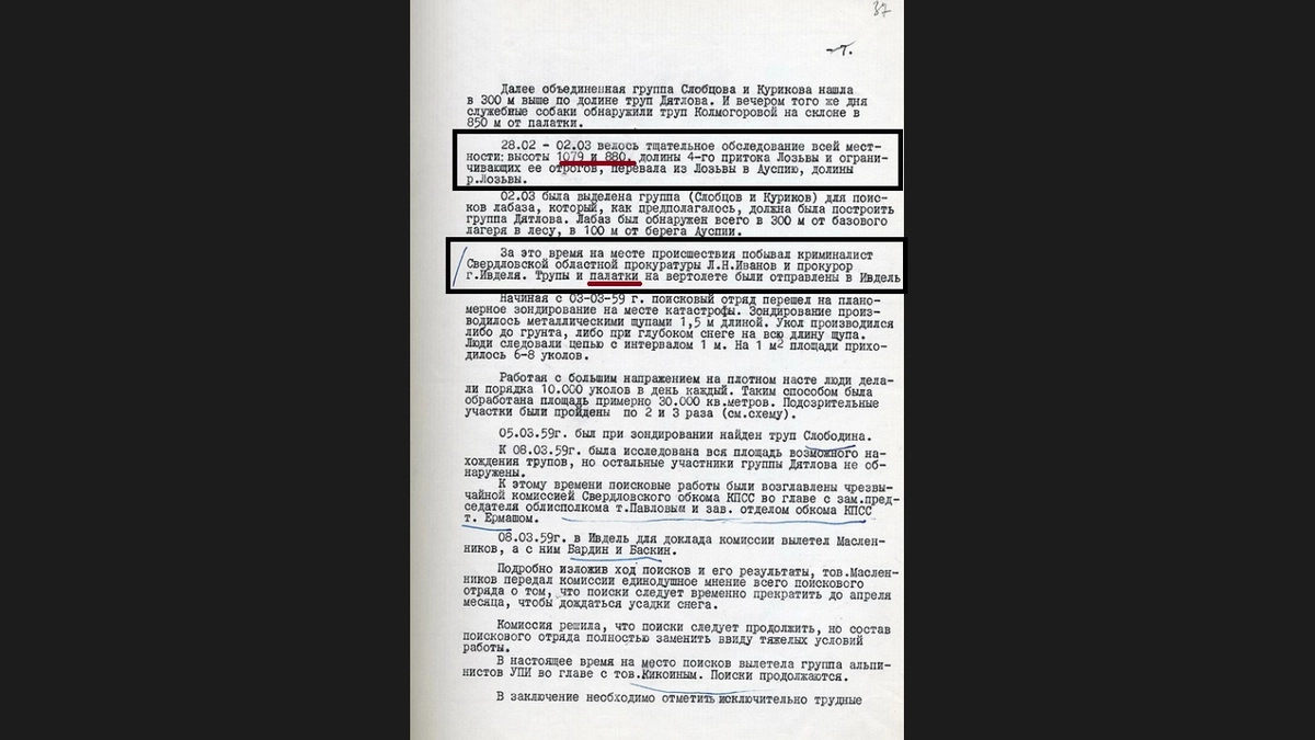 Дальше становится ещё интересней. В документе сказано, что за это время на месте поисков побывал криминалист Областной прокуратуры Л. Н.Иванов и прокурор города Ивдель. Трупы и палатки (!) были на вертолете отправлены в город Ивдель. Палатки, во множественном числе! Из базового и, видимо, не базового лагеря. И это не банальная опечатка.