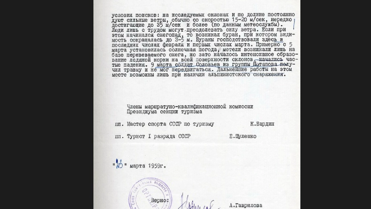 Телеграмма оказалась в правительстве СССР, поэтому сразу же засуетились разные партийные функционеры. Им предстояло дать ответ на все вопросы, сделать это в наиболее кратчайший срок. Именно поэтому докладную записку отправили задолго до окончания расследования. Она была написана 23 марта 1959 года. Напомню, что последние тела погибших ребят были обнаружены только в мае, а на 23 марта поисковые работы были в самом разгаре.