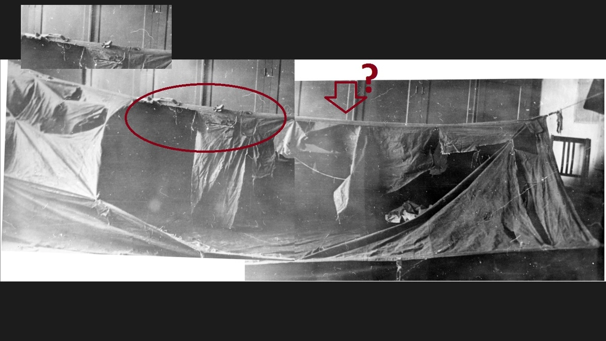 Человек, составлявший записку для ЦК КПСС, знал о том, что было найдено несколько палаток. Если же мы посмотрим на фотографию найденной палатки, то увидим очень интересную деталь. Нет общего плана палатки. Хотя её разместили в актовом зале, но снимали её частями. И вот левая и правая часть принадлежат абсолютно разным палаткам. Они даже разные по конструкции.