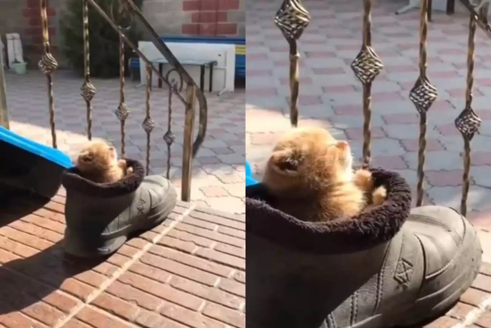 Крошечный рыжий котёнок в мгновение ока прославился на весь мир, и это все благодаря стараниям его хозяев, которые записали на видео, как тот принимает солнечные ванны, сидя в башмаке.