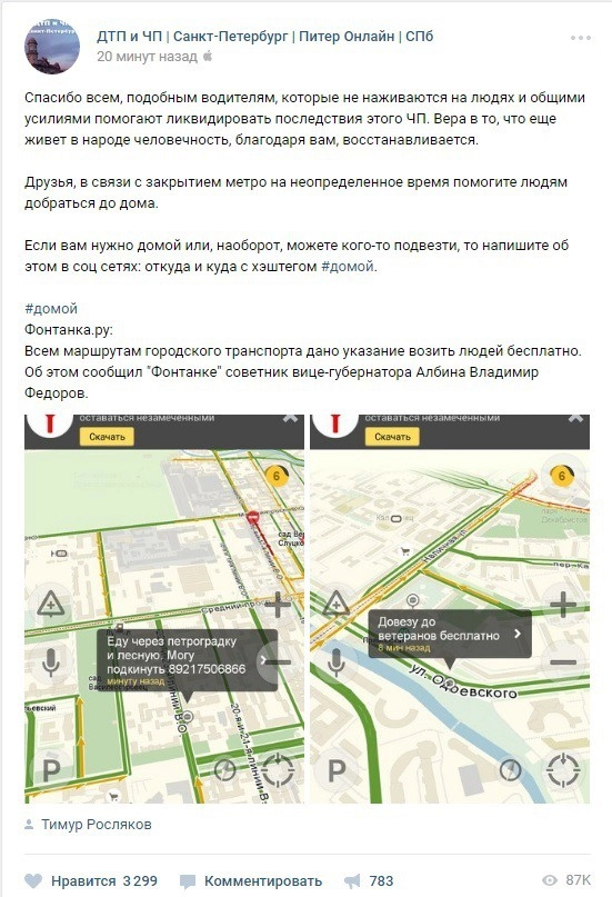 Водители личных автомобилей и сотрудники некоторых служб такси бесплатно развозят людей из центра Петербурга. Весь питерский метрополитен закрыт, люди не могут уехать из центра города.