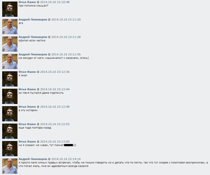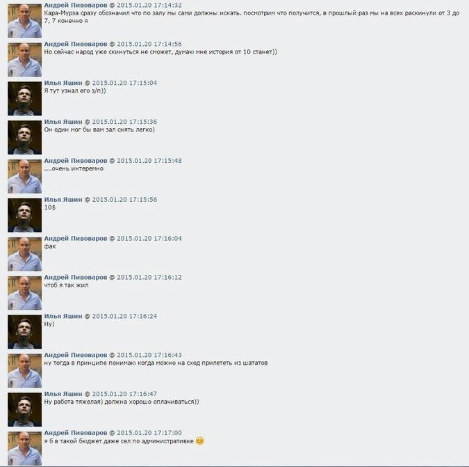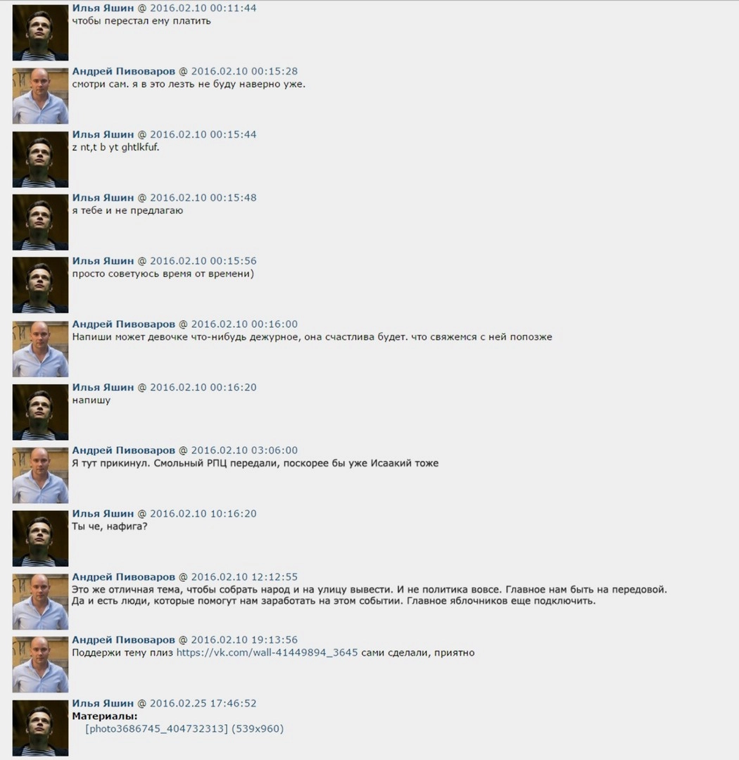 В Сети появились скриншоты личной переписки экс-сопредседателя «Партии народной свободы» Ильи Яшина и координатора движения Михаила Ходорковского «Открытая Россия» Андрея Пивоварова. Видные представители оппозиции размышляют о том, как можно заработать на скандале вокруг Исаакиевского собора, и при этом развлекают друг друга исполнением диковинного «танца крабика».