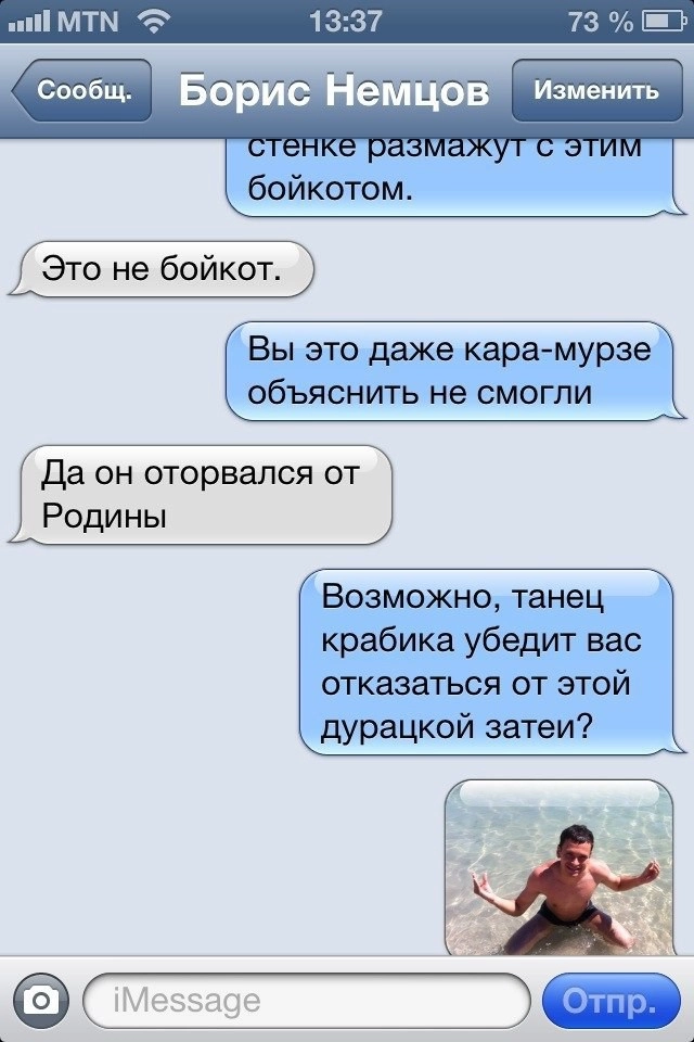В переписке Пивоварова и Яшина имеется весьма неоднозначный скриншот переписки экс-сопредседателя ПАРНАС с политиком Борисом Немцовым. В ней присутствует фото того, как Илья Яшин исполняет для господина Немцова «танец крабика», призывая отказаться от некой «дурацкой затеи».
