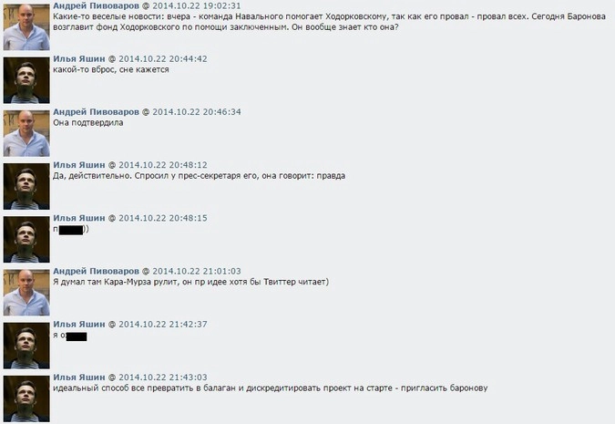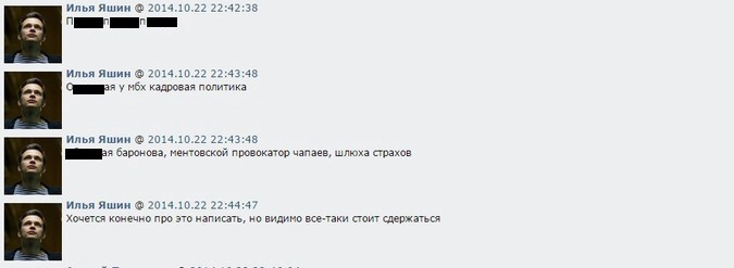 Вот, например, Илья Яшин ругает распоследними словами координатора «Открытой России» Марию Баронову, известную по роли фаворитки бывшего владельца компании ЮКОС Михаила Ходорковского.
