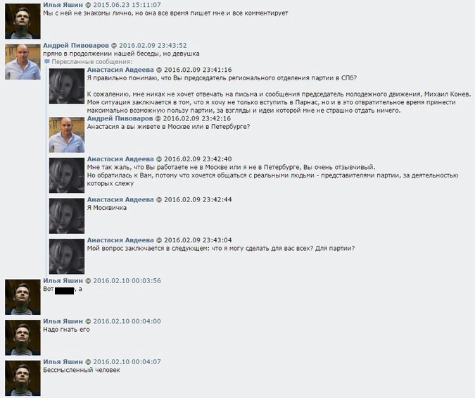 Руководителю молодежного крыла ПАРНАС Михаилу Коневу тоже досталось от Ильи Яшина. «Он проделал путь от неплохого пионер-вожатого для волонтеров до „гомосексуалиста“», — высказался Яшин.