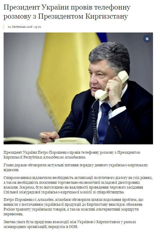 2 ноября на сайте президента Украины появилась информация о том, что глава украинского государства провел телефонные переговоры с президентом Кыргызстана Алмазбеком Атамбаевым.